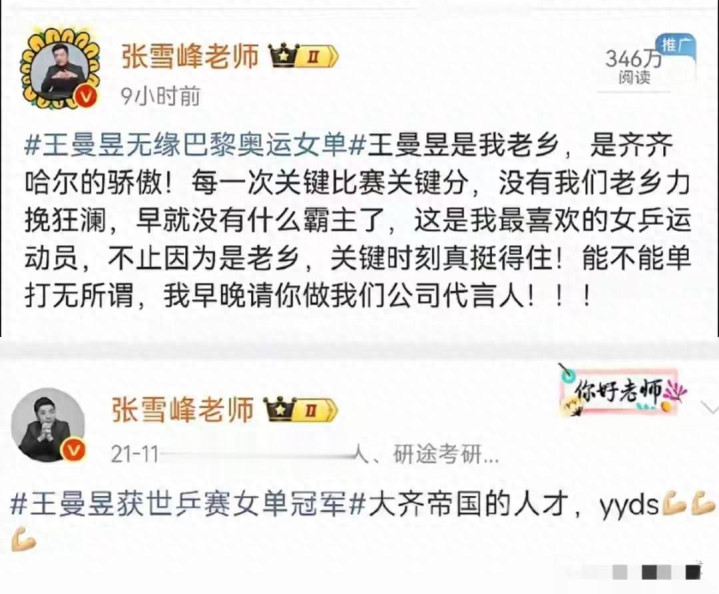 近日,张雪峰敦厚短暂离开的音信霸满了屏幕,一时辰张雪峰的热搜满天飞,球迷短暂思起来,张雪峰还是王曼昱的老乡,Dafabet屡次在直播能够酬酢媒体绝不讳饰地抒发了我方对王曼昱的偏疼,记起王曼昱因为在要害比赛中输给了印度怪胶选手,痛失至极极度的奥运单打契机,张雪峰就在力挺我方的老乡!