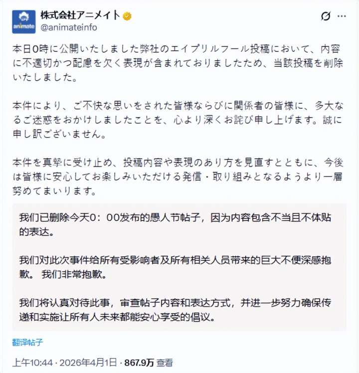 每年愚东谈主节,齐是动漫大厂整活的日子,但本年Animate的愚东谈主节营销,却绝对翻车了,不仅激励了大限制争议,还被动删帖谈歉,成为了近期动漫圈的热点话题。当作日本驰名的ACG大厂,Animate一直深受粉丝信任,没思到此次却因为一个打趣,栽在了“不尊重粉丝圈层”上。