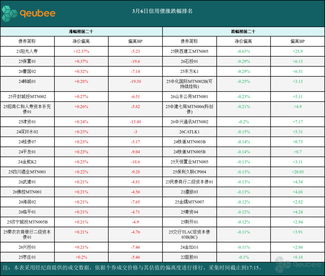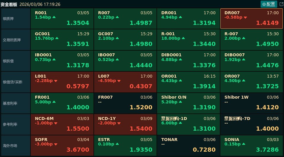 qeubee数据线路,适度3月6日收盘,银行间市集方面,DR001加职权率上行4.94bp至1.3194%,DR007加职权率下行0.58bp至1.4149%;交游所回购市集方面,GC001加权平均利率上行15.76bp至1.3591%,GC007加权平均利率上行2.1bp至1.498%。