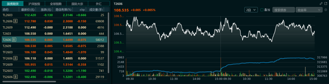 国债期货收盘,30年期主力合约涨0.03%,2年期主力合约跌0.01%,10年期主力合约基本持稳和5年期主力合约基本持稳。(源流:固收轮廓屏)