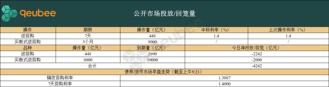据qeubee统计,当天公开市集有2690亿元7天逆回购到期,另有10000亿元买断式逆回购到期,当天达成净回笼4242亿元。