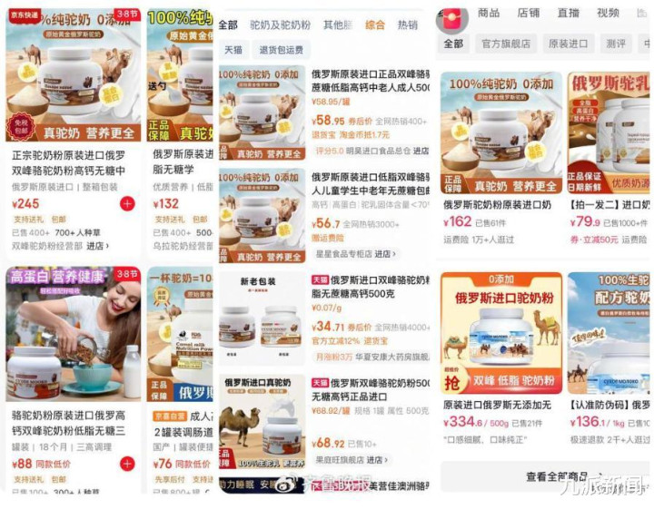 据都鲁晚报,比年来,驼奶粉凭借“寥落奶源、养分更高、更符合老东说念主”等标签,飞速走红养生阛阓。其中,包装洋气、打着“俄罗斯入口”“双峰骆驼”旌旗的驼奶粉,更是在多个网购平台卖得申明鹊起。