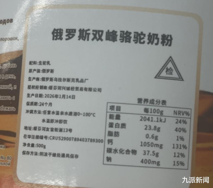 更离谱的还在标签上。按依法程,驼奶粉应该老西席实标注“驼乳粉”或“全脂驼乳粉”,而这些居品冠冕堂皇地写上“俄罗斯双峰骆驼奶粉”,成心朦胧居品类别。包装上莫得标注GB 19644-2024这一国标号,消耗者根柢没法判断它到底属于哪一类居品。标签上只印了一个授权经销商称号,地址写得像模像样,却连一个干系电话都找不到。这仍是赫然违反了入口食物标签的强制要求。“而且像是钙这类微量元素,是不成和卵白质、脂肪等标注在一个内外的。”