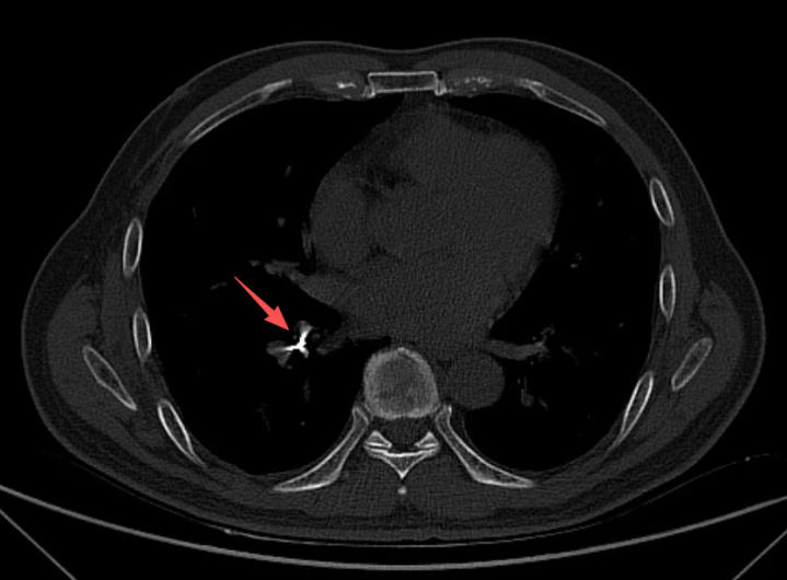 随后,诊所牙医随同男人到北海市东谈主民病院就诊,经CT查验,在患者右下肺支气管内发现存异物存留,便要害收入呼吸与危重症医学科病房。